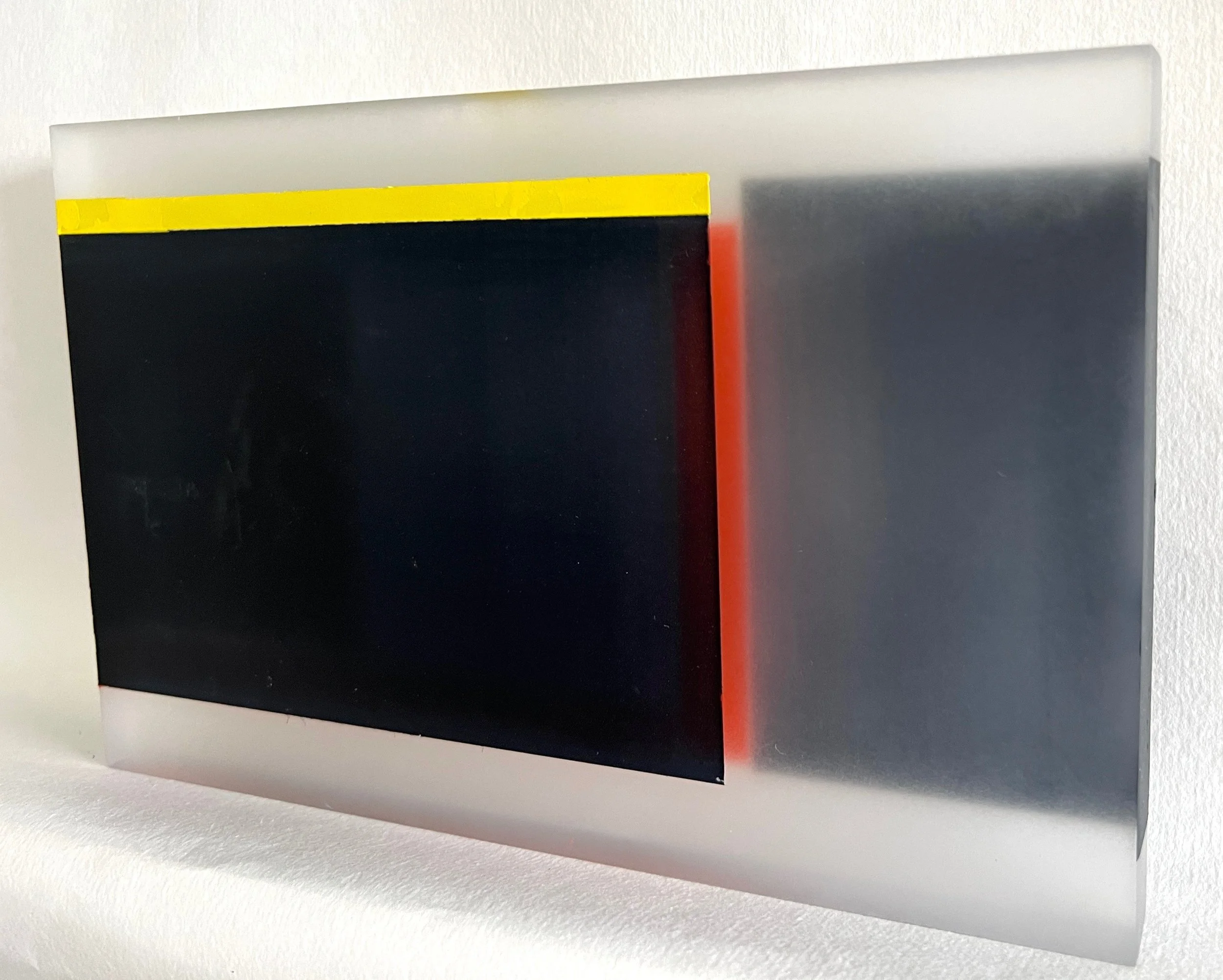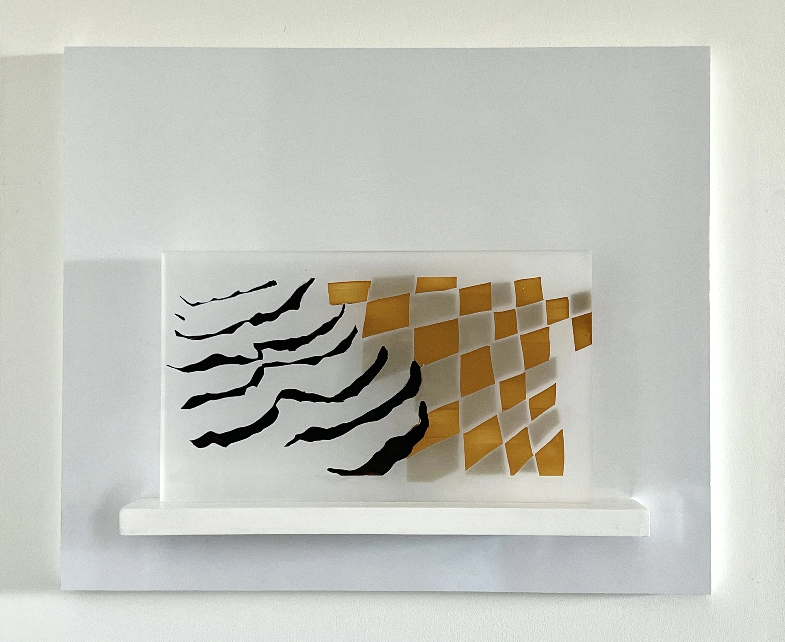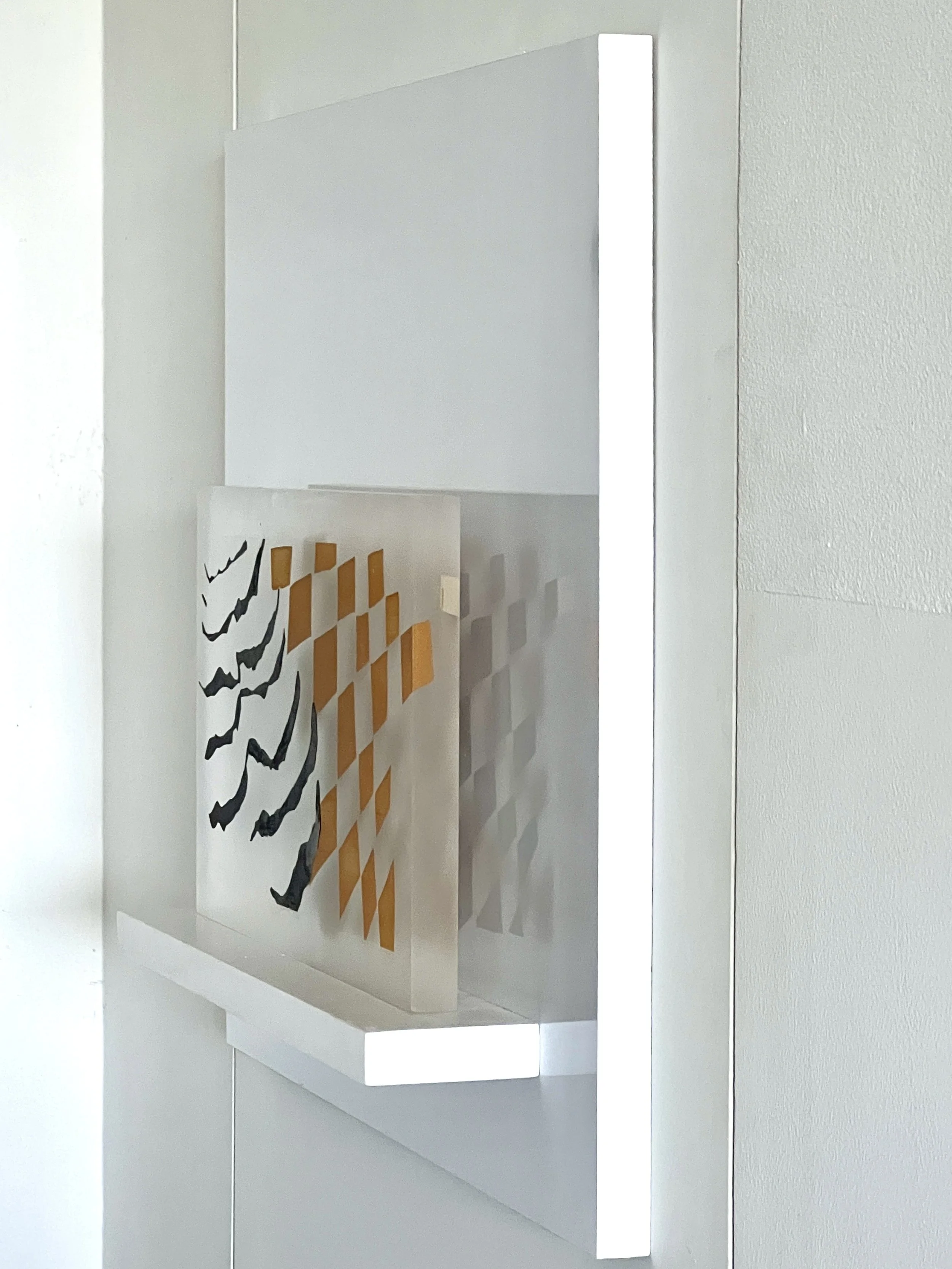 Chimney Swift - 2024, Acrylic on cast acrylic panel 5.25 x 8.25 x .75 inches, 2024 / shelf: gloss formica, MDF, Pine, 14.75 x 16 x 3 inches - An homage to the Chimney Swift. “This enigmatic little cigar-shaped bird spends almost its entire life airborne. When it lands, it can’t perch—it clings to vertical walls inside chimneys or in hollow trees or caves. This species has suffered sharp declines as chimneys fall into disuse across the continent.“