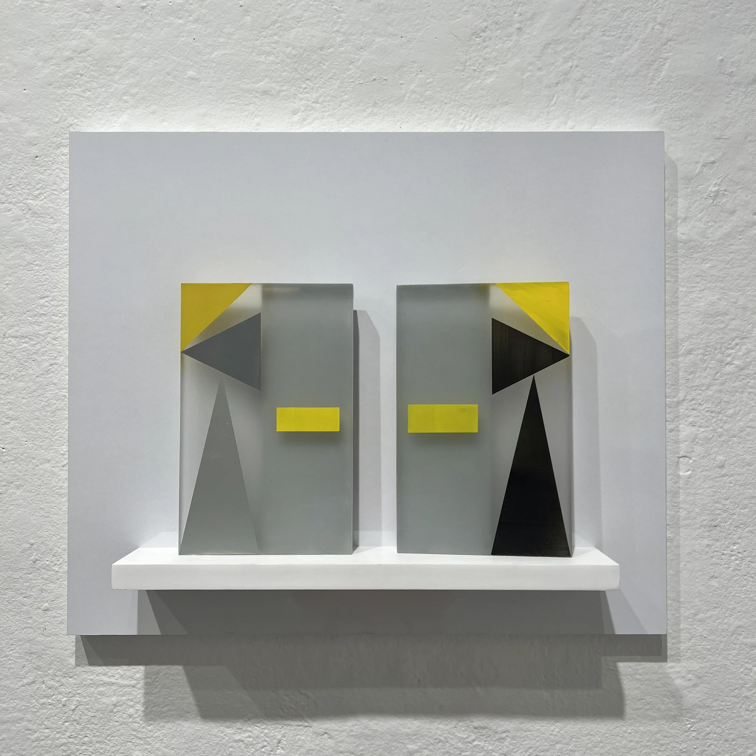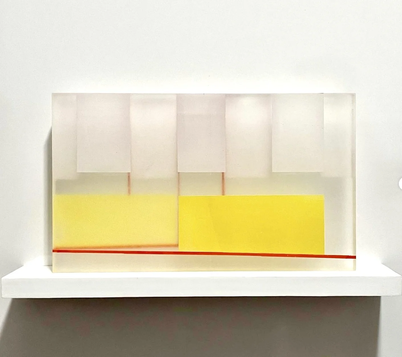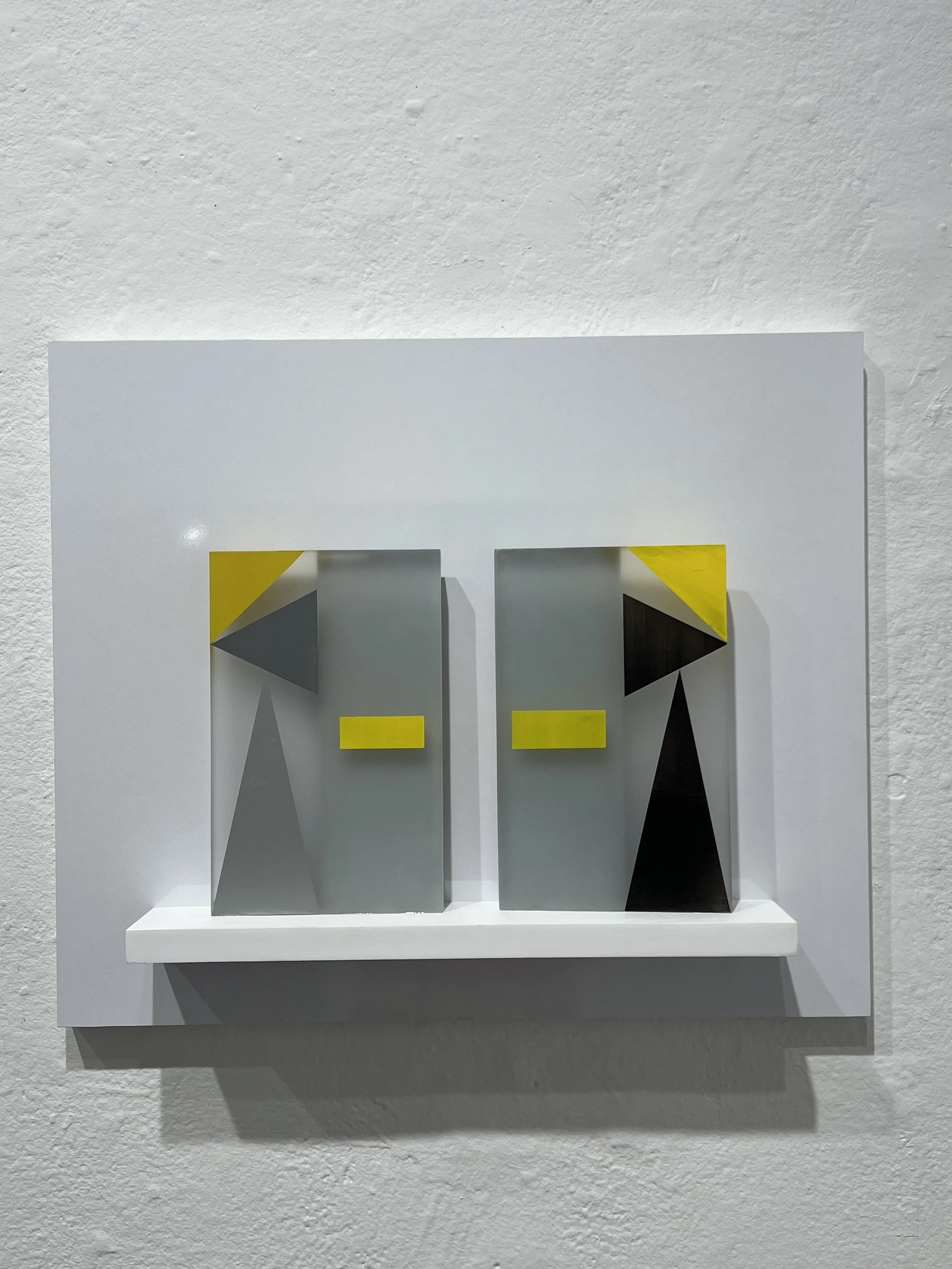 Chimney Swift - 2024, Acrylic on cast acrylic panel 5.25 x 8.25 x .75 inches, 2024 / shelf: gloss formica, MDF, Pine, 14.75 x 16 x 3 inches - An homage to the Chimney Swift. “This enigmatic little cigar-shaped bird spends almost its entire life airborne. When it lands, it can’t perch—it clings to vertical walls inside chimneys or in hollow trees or caves. This species has suffered sharp declines as chimneys fall into disuse across the continent.“