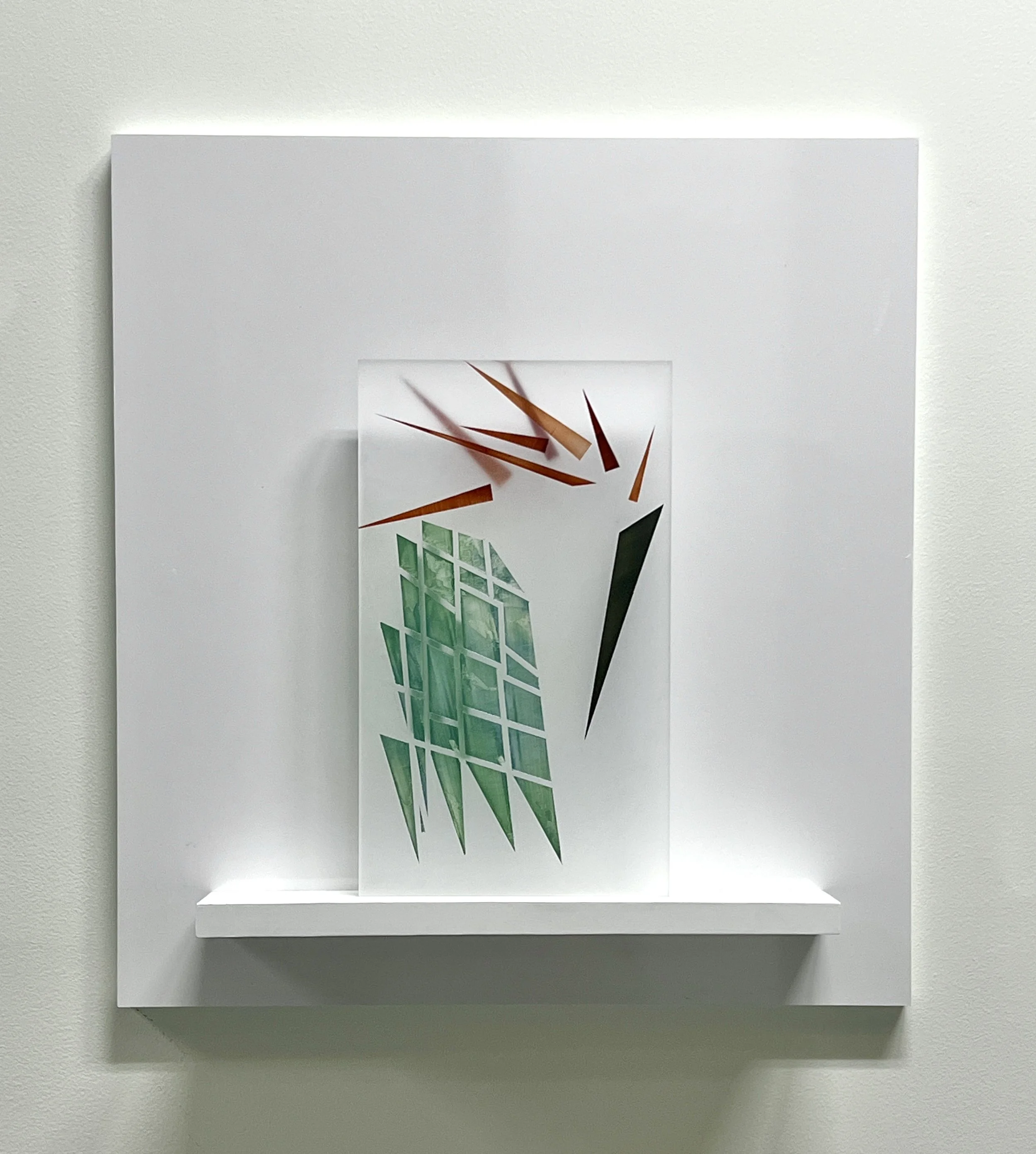 Ruby-crowned Kinglet (detail) - 2022, Acrylic on cast acrylic panel, 5.25 x 8.25 x .75 inches / Shelf: gloss formica, MDF, Pine, 14.75 x 16 x 3 inches